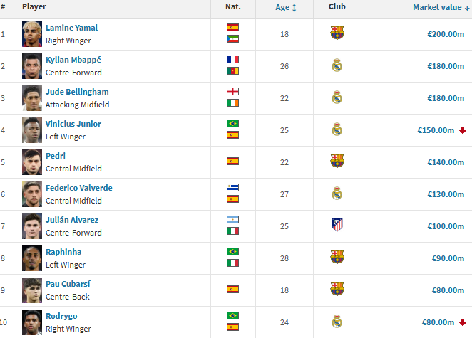 紧随其后的是皇家马德里的两大巨星——姆巴佩和贝林厄姆,他们均以1.8亿欧元的身价并列第二。然而,另一位皇马球星维尼修斯的身价则出现了下滑,从之前的排名跌至1.5亿欧元,位列第四。