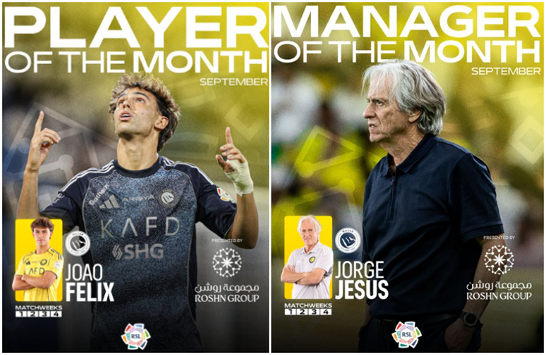 雷速体育10月2日消息,沙特职业足球联赛(沙特联)官方正式公布了九月最佳球员与最佳教练的评选结果。利雅得胜利队葡萄牙前锋菲利克斯凭借惊艳表现荣膺月度最佳球员,而球队主帅若热·热苏斯则凭借卓越的执教能力当选月度最佳教练。