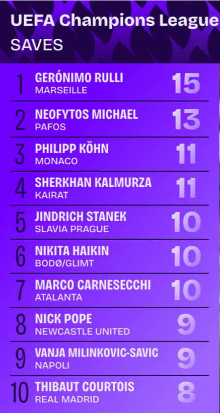 此外,布拉格斯拉维亚门将斯塔尼克、博多闪耀门将凯金以及亚特兰大门将卡内塞基均以10次扑救并列榜单第五至第七位。他们的出色表现也为各自球队在欧冠赛场上筑起了一道坚实的防线。