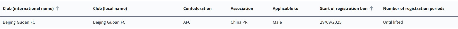 雷速体育10月3日讯,近日,国际足联(FIFA)转会注册禁令公示系统显示,北京国安足球俱乐部在9月29日新增了一条转会注册禁令,该禁令的期限为直至解除为止。