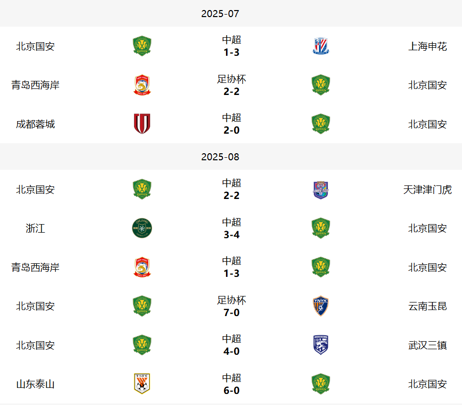 本赛季国安原本是半程第一,却在关键战中连续1比3不敌申花和0比2败给成都蓉城。但随后他们又开始一波连胜,绝杀浙江、击败青岛,更是在足协杯半决赛上7比0大胜云南玉昆后,在联赛又用一场4比0延续上升势头。然而,客场0比6惨败给山东泰山,又让北京国安陷入自由落体般的低迷。