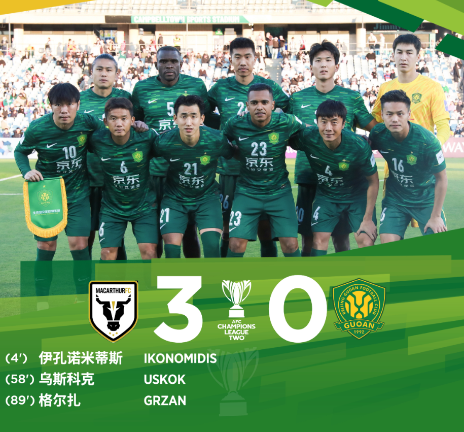北京时间10月2日,亚冠二级小组赛E组迎来一场焦点对决,北京国安客场挑战澳洲球队麦克阿瑟FC。最终,国安以0-3的比分惨败对手,两轮小组赛仅取得1平1负的战绩,仅积1分,出线形势岌岌可危。