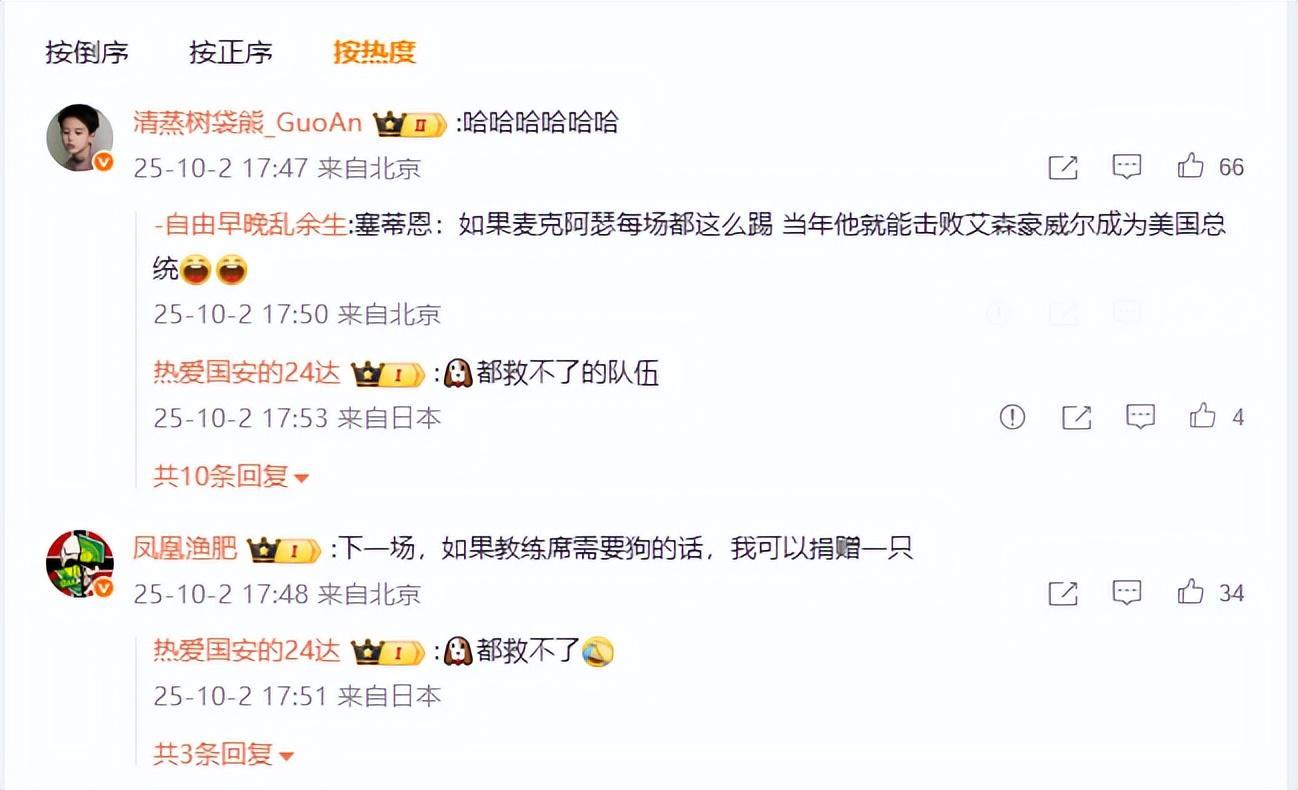 国安官微下也遭到了自家球迷的反戈一击。两大国安著名球迷均发表了言论,“清蒸树袋熊”打了一串“哈哈哈哈哈哈”来发泄情绪,“凤凰鱼肥”则更加犀利地表示:“下一场,如果教练席需要狗的话,我可以捐赠一只。”这样的言论虽然有些偏激,但也反映了球迷们对球队教练用人和战术安排的不满。