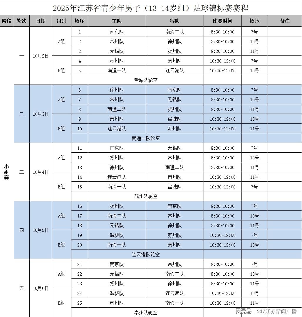 据悉,江苏省青少年男子(13-14岁组)足球锦标赛由省体育局和省教育厅共同主办,得到了江苏体彩的公益支持。参赛的11支球队由各市精心组队,其中青训基础比较深厚的南通组织了两支球队,其他参与的9市都是派出了1支队伍。13-14岁组的男子比赛将于10月8日圆满结束,而女子组比赛则将于本月13日接续打响,让我们共同期待更多精彩对决。