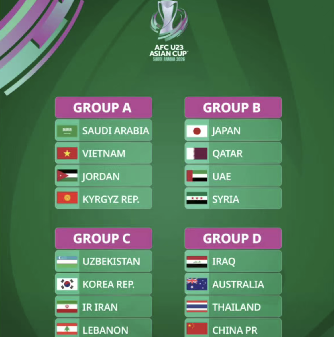 经过抽签,中国队所在的小组中,种子队为伊拉克,第二档球队是澳大利亚,而泰国则作为第三档对手。在A组中,东道主沙特作为第一档球队,将迎战越南、约旦以及吉尔吉斯斯坦。B组的第一档球队是日本,同组还有卡塔尔、阿联酋以及叙利亚。C组的种子队则是乌兹别克斯坦,另外三支球队为韩国、伊朗以及黎巴嫩。