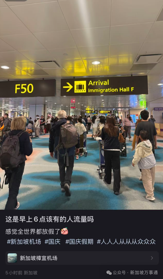 有网友一大早抵达樟宜机场,就被现场的人流量震惊到。早上6点,机场已经人满为患,几乎是“人挤人”。网友直呼:“感觉全世界都在放假!”