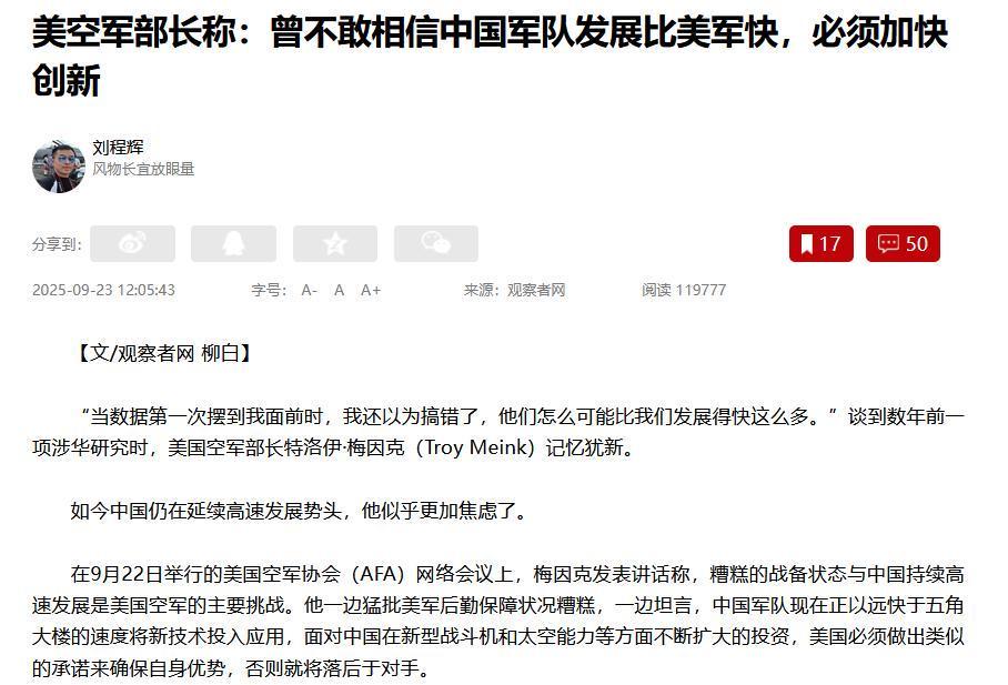 《美空军部长称:曾不敢相信中国军队发展比美军快,必须加快创新》——观察者网
