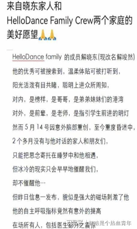 最后,就希望走了的小解晓东能安息,在另一个世界还能跳自己喜欢的舞。希望他的父母能慢慢好起来,街坊邻居多帮衬帮衬。
