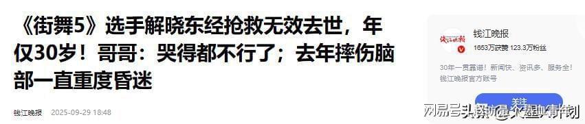 前几天,春晚老熟人解晓东还在大湾区晚会上与孩子同台演唱,笑容温和,转眼却传来另一个同名解晓东离世的消息。这位年仅30岁的街舞新星,因去年一场意外摔伤头部,昏迷一年多后,最终还是未能战胜病魔,令人扼腕叹息。