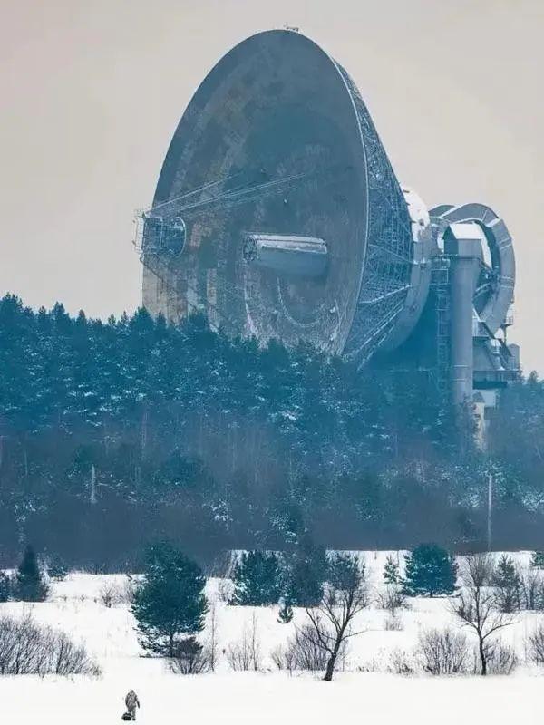 RT-64射电望远镜,这座冷战时期的科技巨擘,其高耸的景观在照片中显得尤为壮观。它不仅是深空通信和射电天文学的重要组成部分,更是苏联科技实力与野心的象征。在这张捕捉到RT-64的照片中,巨大的天线结构与下方一个孤独的人形形成了鲜明的对比,这种惊人的尺度感,让人不禁感叹在暴力美学面前,人类如同蝼蚁般渺小。