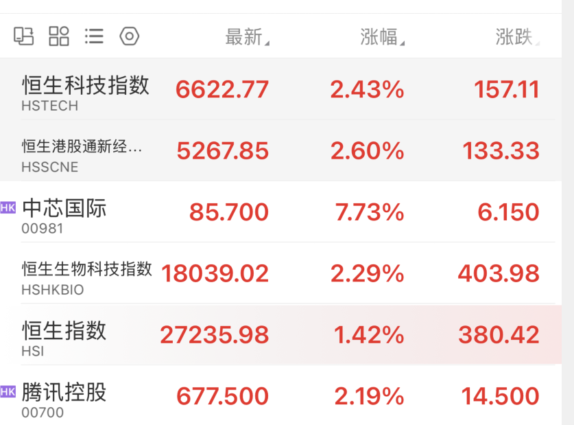截至发稿时,恒生指数上涨1.42%,恒生科技指数涨幅达2.43%。科技巨头集体走强:中芯国际涨7.33%、百度集团-SW涨4.2%、阿里巴巴-SW涨3.4%、京东集团-SW涨2.5%,小米集团-W涨1.57%。新能源板块表现突出,锂电池概念股大幅拉升,天齐锂业涨超10%,赣锋锂业涨超9%,宁德时代涨超3%。黄金股同步走强,紫金黄金国际涨9.7%、潼关黄金涨超7%、灵宝黄金涨超5%。