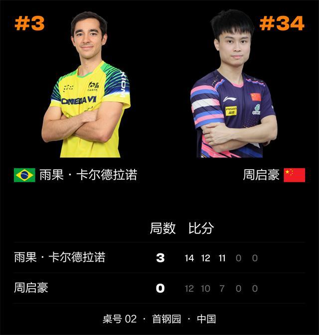 在WTT中国大满贯男单1/8决赛中,周启豪以0-3的比分不敌巴西名将雨果-卡尔德拉诺,遗憾无缘8强。三局比分分别为12-14、10-12、7-11,每一局都显得异常胶着。