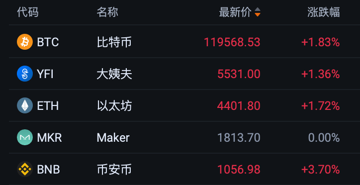 数字货币市场同步掀起上涨狂潮。比特币盘中突破11.9万美元大关,以太坊亦突破4400美元。相关概念股表现抢眼,嘉楠科技涨超28%,GD CULTURE涨超11%,比特数字涨超8%,显示市场对加密资产的热情持续高涨。