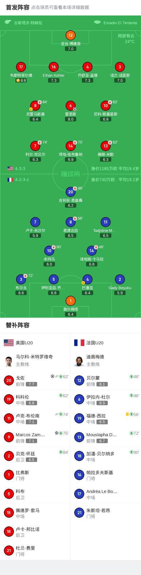 下半场补时阶段,美国U20再次发起猛攻。桑布拉诺挺身而出,他抓住机会,攻入锁定胜局的一球。最终,美国U20以3-0的比分完胜法国U20,赢得了这场关键的比赛。