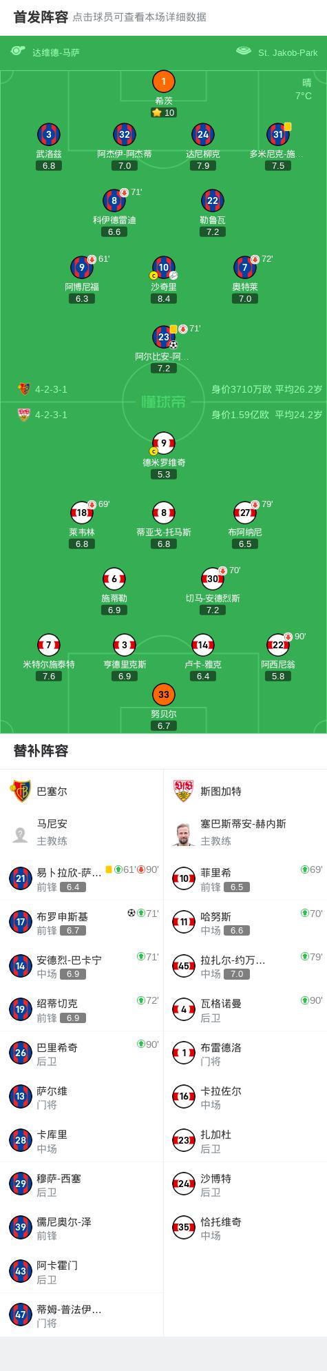 根据赛后技术统计,巴塞尔全场控球率达58%,射门次数12次(5次射正),而斯图加特仅获得8次射门机会(2次射正)。点球失利成为客队最大遗憾,而主队两次关键进攻均转化为进球,展现出高效进攻能力。