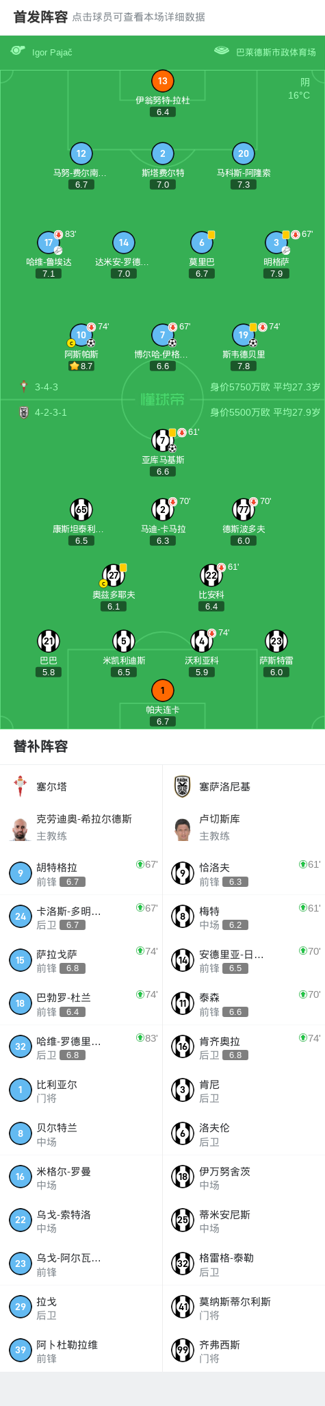 比赛伊始,塞萨洛尼基便展现出强烈的进攻欲望。第37分钟,塞萨洛尼基球员亚库马基斯抓住机会,率先为球队打破僵局,将比分改写为1-0。这一进球让现场气氛瞬间紧张起来,塞萨洛尼基的球迷欢呼雀跃,而塞尔塔的球迷则开始为球队捏一把汗。