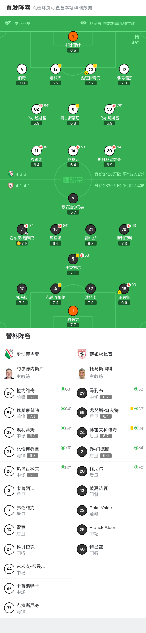 华沙莱吉亚(4-2-3-1):12-拉多斯拉夫·马耶茨基(GK)/ 2-马特乌什·维特卡、5-马特乌什·霍莫拉、4-伊戈尔·莱万多夫斯基、3-帕维尔·沃尔斯基 / 8-多米尼克·纳莱克、6-塞巴斯蒂安·希曼斯基 / 7-约苏亚·吉列尔梅、10-卡罗尔·斯维德斯基、11-卢卡什·祖罗夫斯基 / 9-托马什·佩卡特