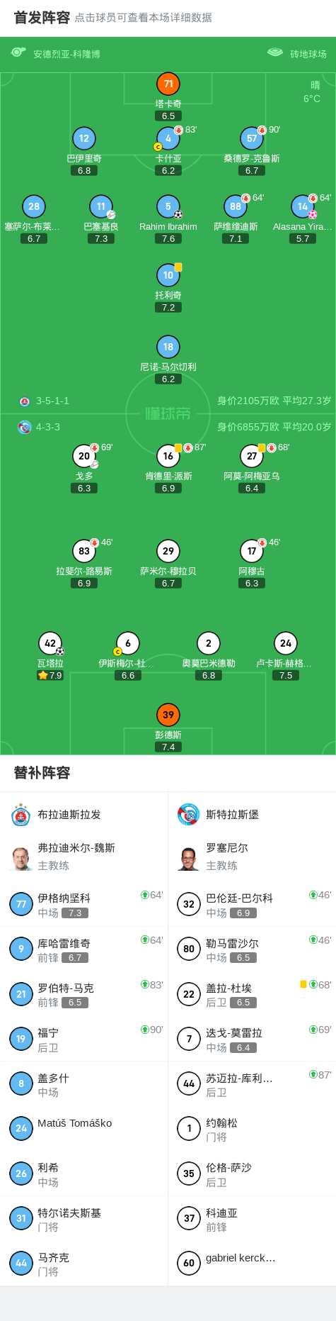开场后双方迅速进入状态,第26分钟出现戏剧性一幕:布拉迪斯拉发后卫Alasana Yirajang在解围时不慎将球碰入自家大门,斯特拉斯堡意外取得领先。第41分钟,斯特拉斯堡扩大优势——戈多送出精准直塞,瓦塔拉高速插上单刀破门,将比分改写为2-0。