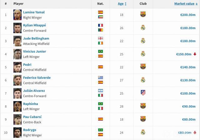 西甲更新身价,姆巴佩1.8亿,佩德里1.4亿,小蜘蛛1亿