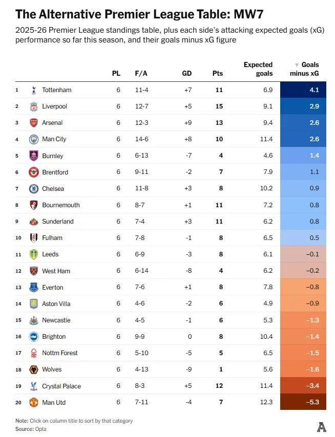 根据The Athletic统计,曼联预期进球12.3个,实际进球7个,是英超实际进球与预期进球相差最大的球队。TA报道称,曼联本赛季英超场均预期进球数为2.05个,部分原因是姆伯莫和库尼亚的加盟,但射门次数(场均15.3次,联赛最高)也是一个因素。曼联的射门中很大一部分来自禁区外,这意味着它们会增加累计预期进球数,但通常质量不高。姆伯莫(20球,预期进球12.3个)和库尼亚(15 球,预期进球8.7个)排在上赛季英超实际进球比预期进球多的球员前三位,但本赛季他们合计只进了一球,预期进球数为2.8个。再加上B费两次失点,曼联目前的处境似乎是因为在进攻三区缺乏信心。运气也是一个因素,曼联四次击中门框,比其他任何球队都多。在本赛季英超预期进球值与实际进球值榜单中,热刺是表现最好的,他们实际进球比预期进球多4.1个,利物浦(2.9个)、阿森纳(2.6个)、曼城(2.6个)分居二至四位。