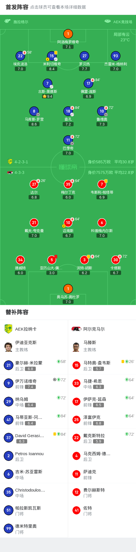 比赛伊始,阿尔克马尔便遭遇了重大打击。仅仅在第2分钟,球员亚历山大-佩内特拉就因犯规被主裁判出示红牌罚下,这使得阿尔克马尔在接下来的比赛中陷入了人数劣势。这一突发情况无疑为AEK拉纳卡创造了绝佳的进攻机会。