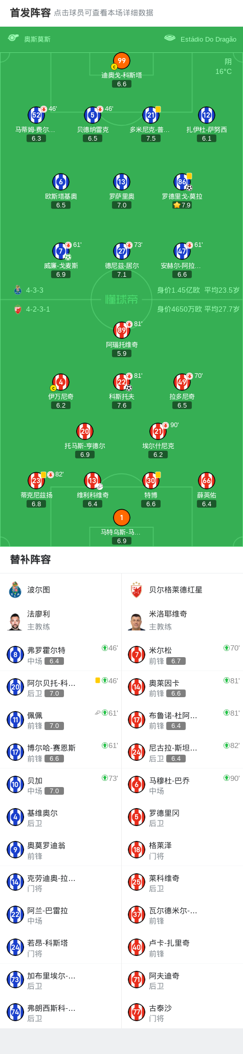 本场比赛波尔图排出4-3-3阵型,佩佩领衔后防线;贝尔格莱德红星则以4-2-3-1应对,科斯托夫担任单箭头。双方主教练的战术博弈成为比赛另一大看点。