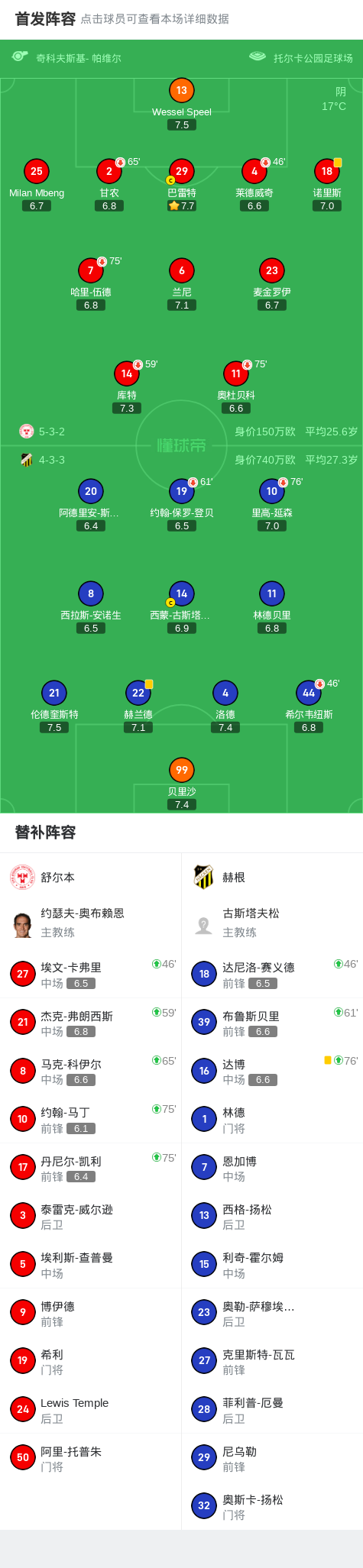 球队阵容方面,舒尔本与赫根均派出了各自的主力阵容出战。双方球员在场上都展现出了极高的职业素养和竞技水平,为球迷们奉献了一场精彩的比赛。