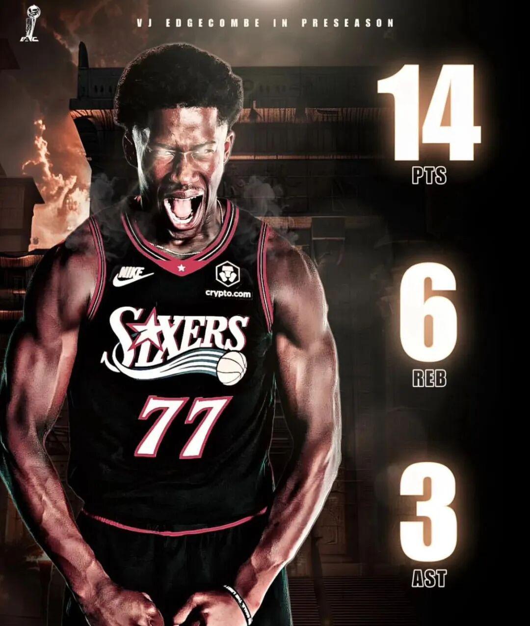 25届探花秀VJ-埃奇库姆(费城)在此役迎来了自己NBA季前赛首秀,以首发分卫身份出战,亮相时间为全场最高的约31分钟,投篮13中4,其中三分6中1,罚球5中5贡献14分6板3助,正负值+1。他的身体天赋的确疯狂,但投篮还是有很大的提升空间。