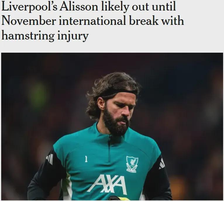 根据TA记者DO的最新消息,利物浦门将阿利松因腿筋受伤,预计将缺席长达6周时间。这意味着这位33岁的巴西门将可能无法出战接下来对阵切尔西、曼联、皇马和曼城的焦点赛事,复出时间或将推迟至11月份的国际比赛日后。