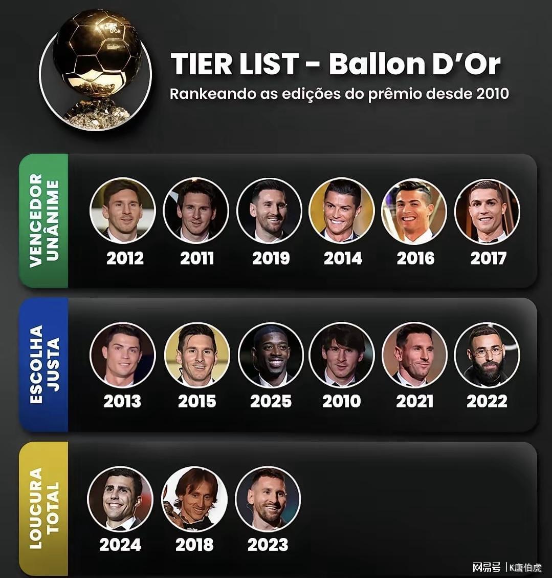 根据权威体育媒体的分析,2010年后梅西与C罗在金球奖评选中各自拥有三个毫无争议的获奖年份。梅西方面包括2012年、2011年及2019年;C罗则囊括2014年、2016年与2017年。这些奖项的归属充分体现了两位巨星在不同时期的统治力。