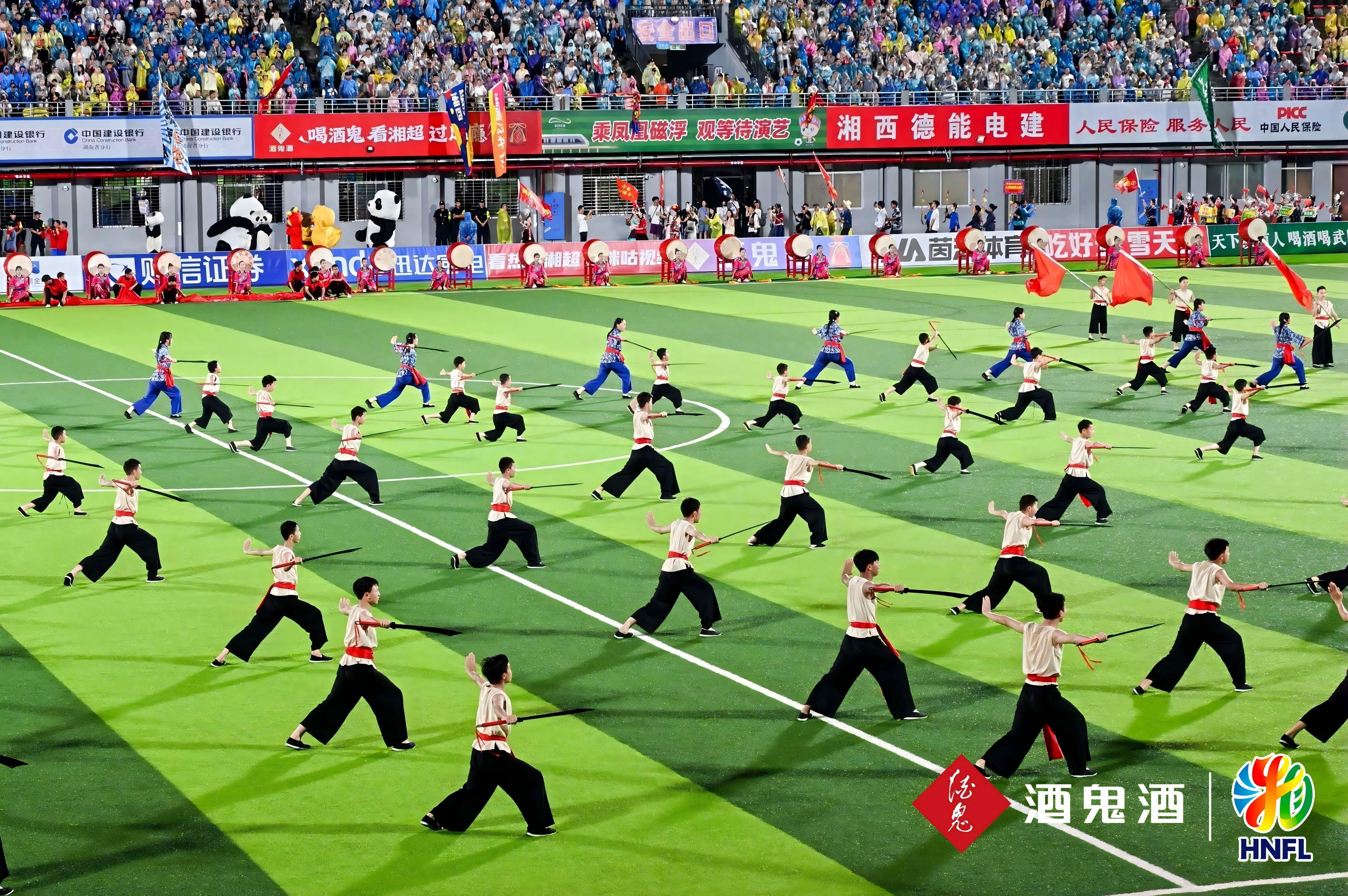 湘超的魅力,远不止于足球竞技的精彩。它更像是一个流动的湖南文化精神展示平台,生动展现出湖南人“吃得苦、霸得蛮”的精神内核。在酒鬼酒冠名的湘西赛区,绿茵场秒变湘人“霸得蛮”的舞台:苗鼓震天,鼓点里全是“霸蛮”的心跳;国家级非遗“破锋八刀”,刀锋劈出“霸蛮”的锋芒。再配上产自湘西的馥郁美酒——酒鬼酒,浓郁的民族风情扑面而来,让现场观众仿佛置身一场精彩绝伦的沉浸式民族文化博览,真正实现“看一场球赛,品一方文化”。