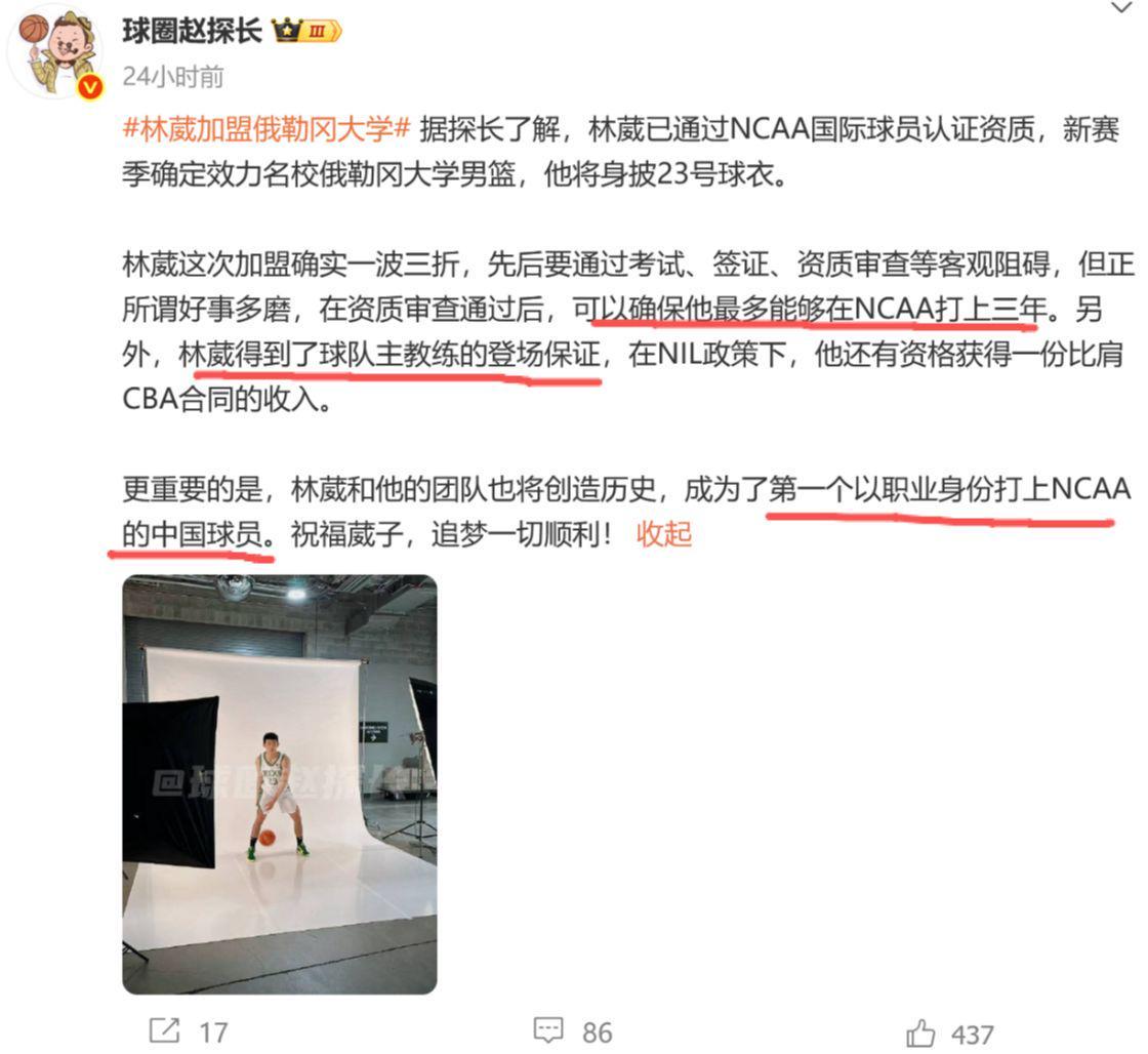 此前,关于林葳将加盟NCAA俄勒冈大学的消息便已传开,但直到10月2日,其经纪公司精英传奇体育才正式宣布这一重磅消息:林葳将在新赛季加盟这所NCAA篮球名校。作为首位以职业球员身份加盟NCAA的中国球员,21岁的林葳开启了历史性的留洋之旅。考虑到NCAA的NIL政策,林葳不仅能获得稳定的出场机会,其收入也将与CBA合同相当,这无疑比在CBA“躺平”更具发展前景。