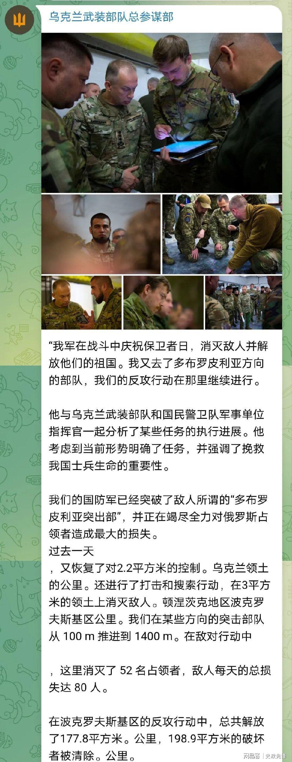 乌军总司令谢尔斯基昨日视察了该战场,他透露,乌军昨日在该方向解放了2.2平方公里的土地,清除了3平方公里的俄军控制区,毙伤敌人80名,其中当场击毙52人。在波克罗夫斯基区的反攻行动中,乌军共解放了177平方公里的领土,清除了198.9平方公里的敌人控制区。而俄军9月的战场收益为269平方公里(12个主战场总和),比8月份减少了40%。