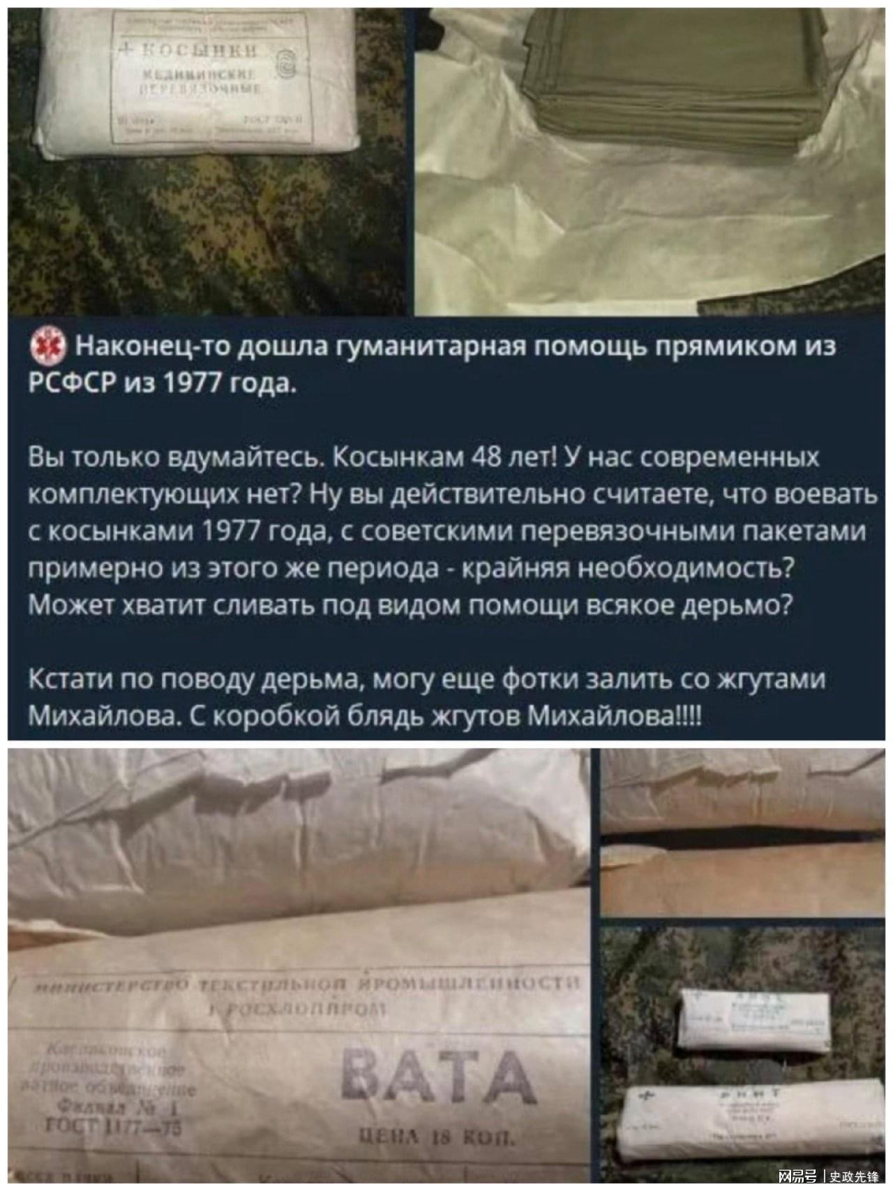 相关俄媒报道,俄军战术医疗小组对前线的物资提出了质疑。他们指出,收到的医疗用品如绷带、止血带等均为苏联时期(1977年)生产的库存,这引发了人们对俄军后勤保障能力的担忧。