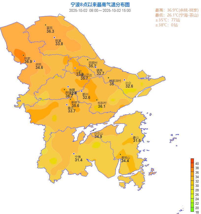 今天白天最高温度:浙北北部和东南沿海地区31-33度;其它地区34-36度。