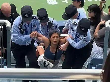 很快,维护赛场秩序的警察赶到了现场,对女子进行劝告。然而,她不但不听劝,还对着警察吐口水,情绪已经完全失控。警察多次劝告无果后,只得将她带出赛场。这名女子在被带出赛场的过程中,仍然大喊大叫,声嘶力竭地喊着,丑态百出。