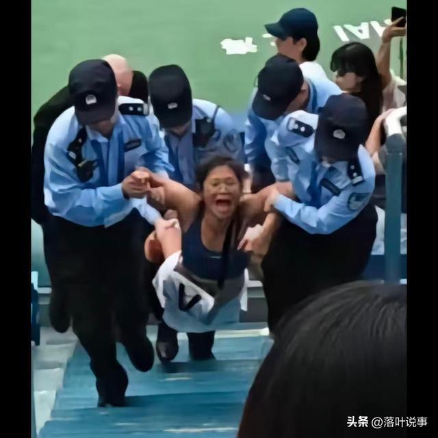 眼看着事情越闹越大,再这样下去可能比赛都得因此拖延很久,帽子叔叔当机立断,几个人将她团团围住,想要将她带离场馆,然而女子却极力反抗,手指帽子叔叔大声呵斥。
