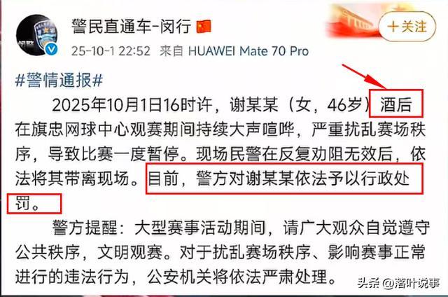后续官方也是发布了通报,原因是她饮酒后去参观比赛,目前已经被予以行政处罚。