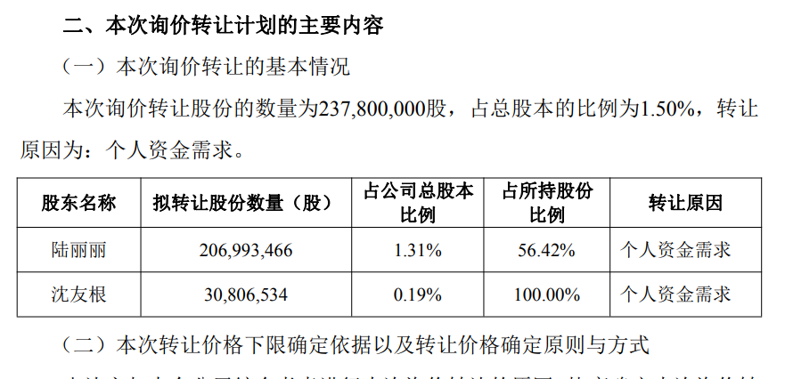 东方财富的减持动作更为引人注目。9月30日晚,公司公告称,股东陆丽丽、沈友根计划通过询价转让方式转让1.5%公司股份。陆丽丽、沈友根分别是东方财富实控人其实的妻子和父亲。本次转让中,陆丽丽转让2.07亿股,套现金额大约56亿;沈友根转让3081万股,套现8.35亿,且为清仓式减持。