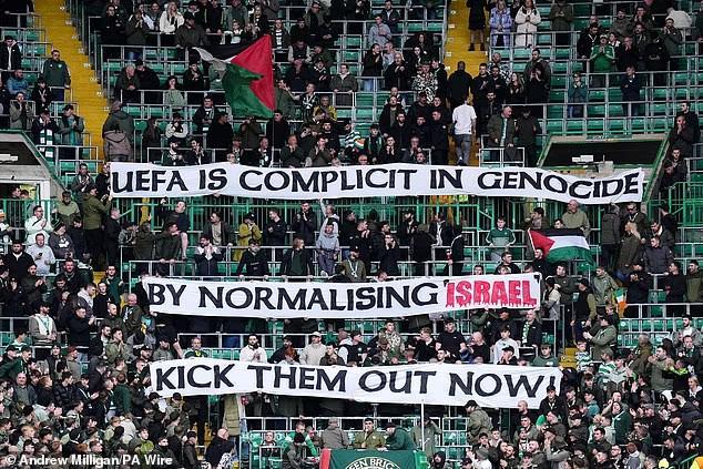 在周四晚进行的欧联杯小组赛中,凯尔特人客场不敌布拉加。比赛开球前,部分凯尔特人球迷在看台角落处展开一条横幅,内容直指欧足联“共谋种族灭绝”,并呼吁将以色列球队排除出欧洲赛事。