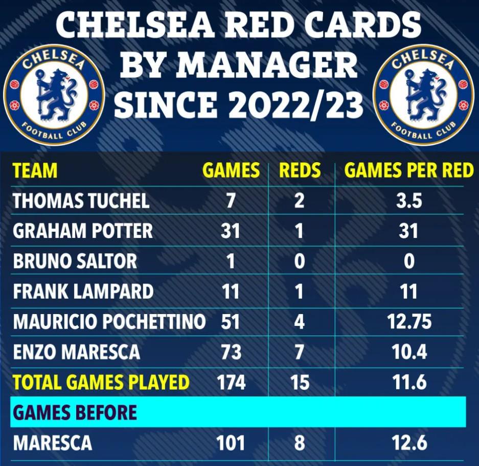 数据显示,在对阵本菲卡的比赛前,马雷斯卡与佩德罗-内托都曾指出,切尔西在过去6个月里仅输了5场比赛,而其中4场失利都发生在“有球员被罚下”的情况下。周二晚间的比赛中,切尔西虽避免了“因红牌输球”的命运——佩德罗吃到第二张黄牌时比赛已临近结束,本菲卡无力翻盘,但这张无谓的红牌仍为马雷斯卡执教期间的“纪律问题”再添一笔。