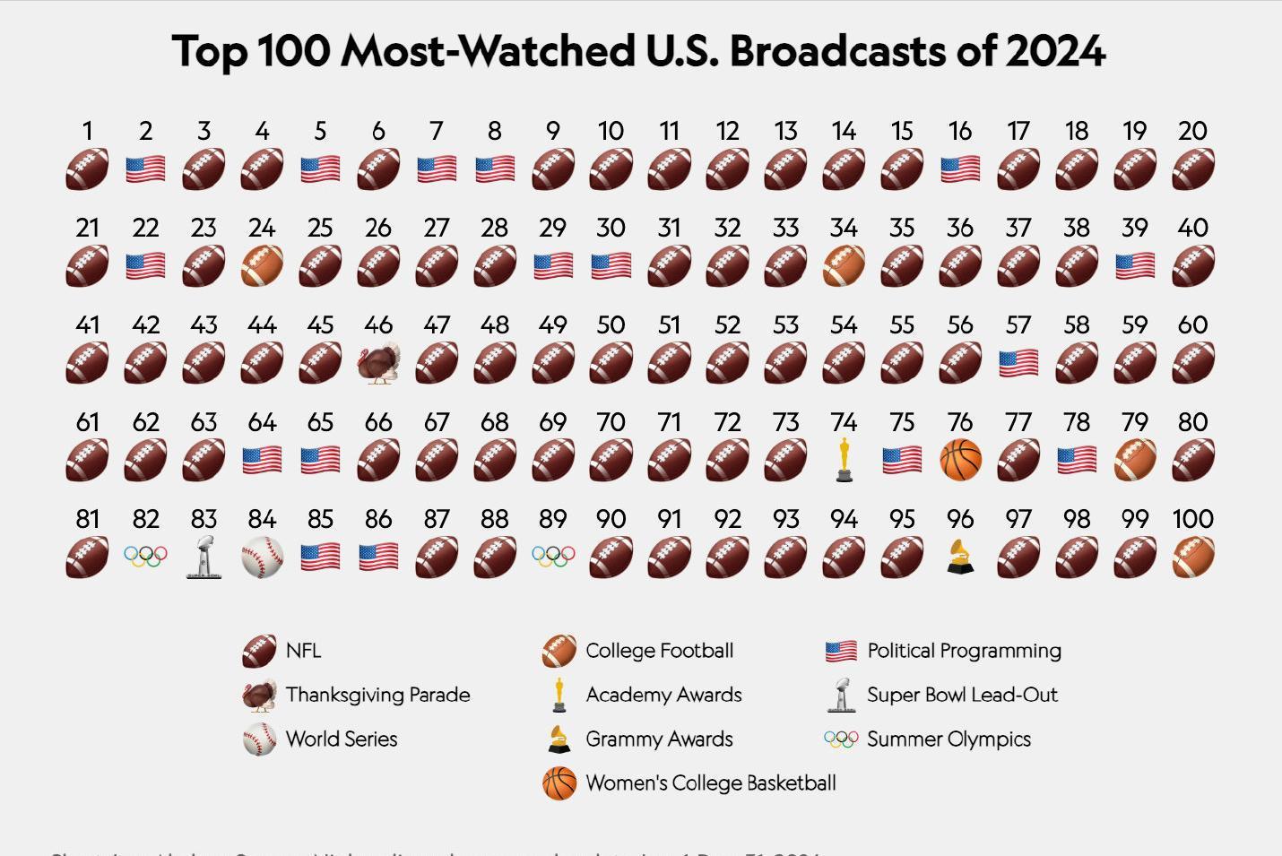 根据知名体育商业媒体Sportico统计,2024年全美收视率前百的比赛中没有NBA比赛。NBA认为,球星负荷管理导致的频繁轮休是重要原因,因此针对性修改了各项奖项评选,增加了常规赛出战场次要求。