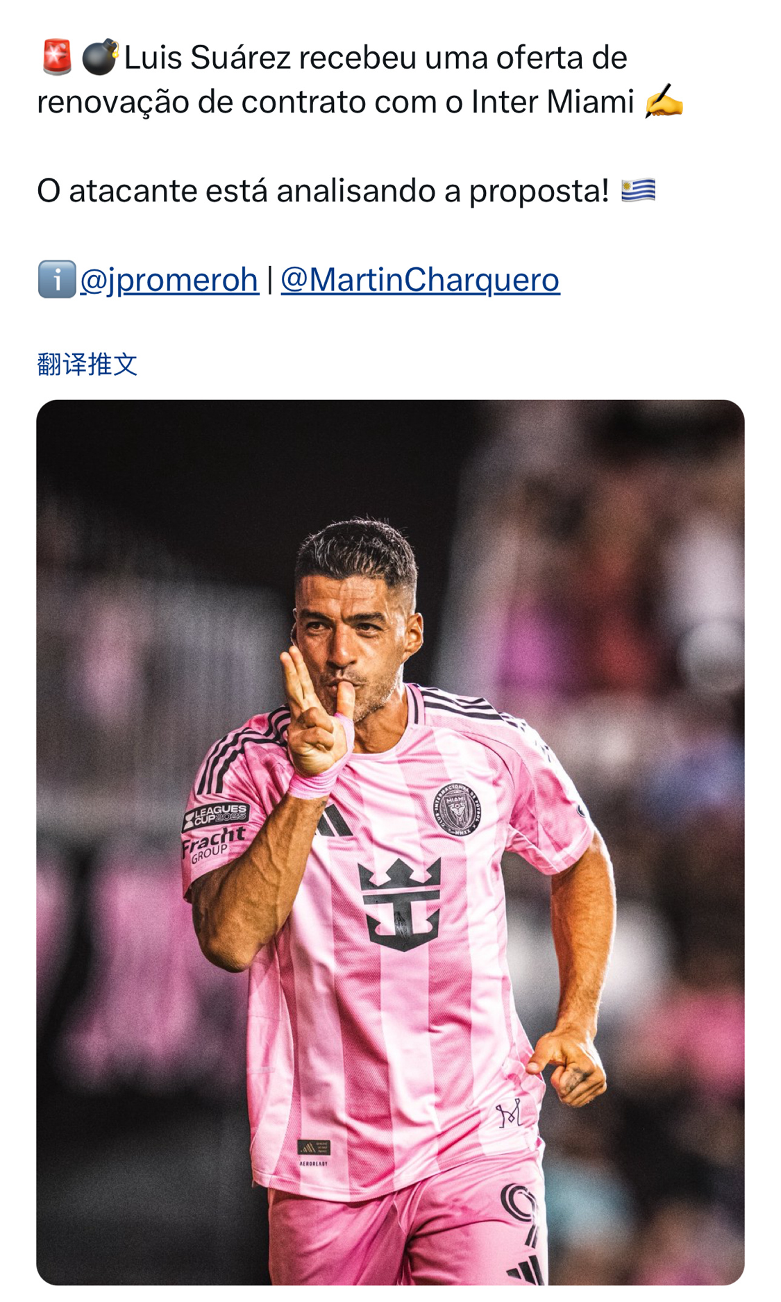 10月3日,据知名记者jpromeroh、MartinCharquero等联合报道,迈阿密国际已正式向乌拉圭前锋苏亚雷斯发出续约邀请。尽管苏亚雷斯尚未立即接受,但这一动作被外界视为球队留住核心球员梅西的重要布局。