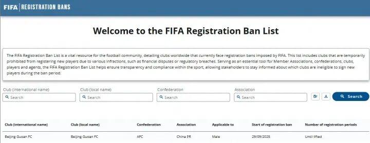 近日,国际足联(FIFA)官方注册禁令披露系统公布了最新动态,中超老牌劲旅北京国安因涉及合同纠纷,被实施了一项无限期转会禁令。该禁令明确指出,在案件得到彻底解决之前,北京国安将无法进行任何国际或国内的球员转会操作,也无法为新球员完成注册。