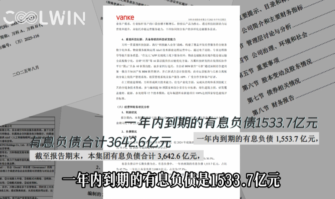 截止2025年中期,万科的有息负债合计3642.6亿元,一年内到期的有息负债1533.7亿元。