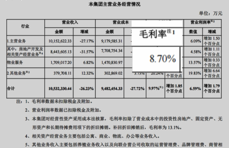 根据万科的财报,万科房地产开发业务的毛利率为8.7%,尽管较去年同增加1.46个百分点,但仍低于行业水平。