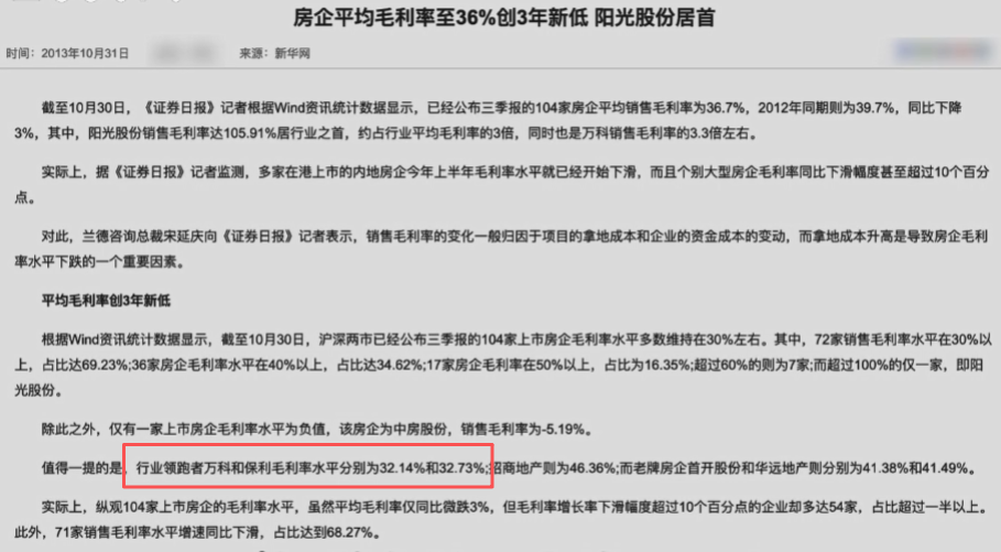 要知道在最风光的2013年,万科的毛利率高达32.14%。
