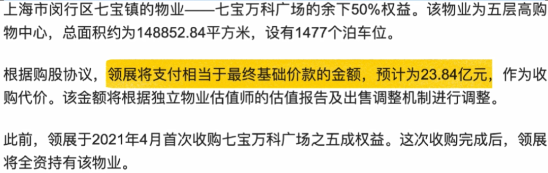 万科最赚钱的综合体,七宝万科广场,也在去年以 23.84 亿元卖掉了。