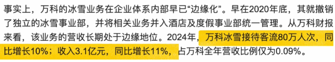 根据万科2024年的年报,公司旗下V.SKI,也就是万冰雪公司,2024年接待了80万人次,同比增加10%,实现业务收入3.1亿元,同比增加11%。
