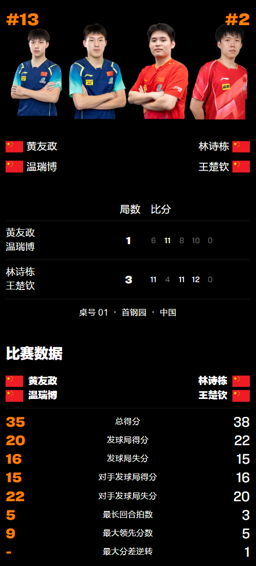 首局比赛,王楚钦/林诗栋凭借高质量单板和流畅配合迅速建立优势,以11-6先下一城。次局黄友政/温瑞博发起猛攻,开局连得5分压制对手,最终以11-4扳平比分。第三局国乒组合通过台内控制与加力进攻重夺主动权,11-8再下一城。第四局对手虽在9-10落后时请求暂停并追至局点,但王楚钦/林诗栋顶住压力,以12-10完成逆转晋级。